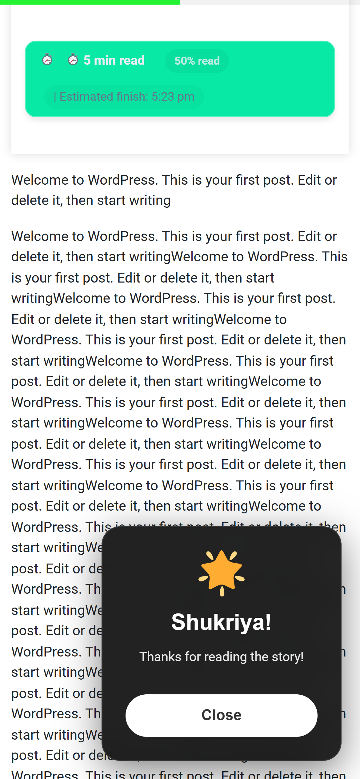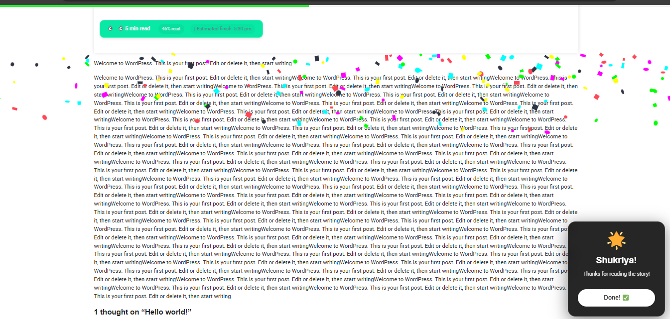 It’s a beautiful reward popup that appears when readers finish your article, thanking them with personalized messages and confetti animation!