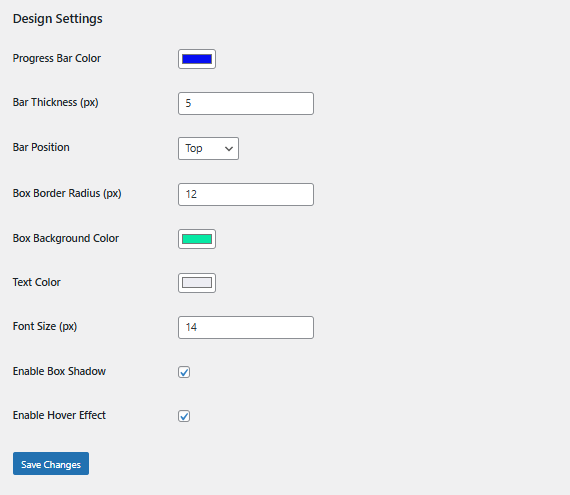 Advanced Design Settings – Color pickers for progress bar, reading time box styling, text colors, background colors, plus size controls (bar thickness, font size, border radius) and effect toggles (box shadow, hover effects)