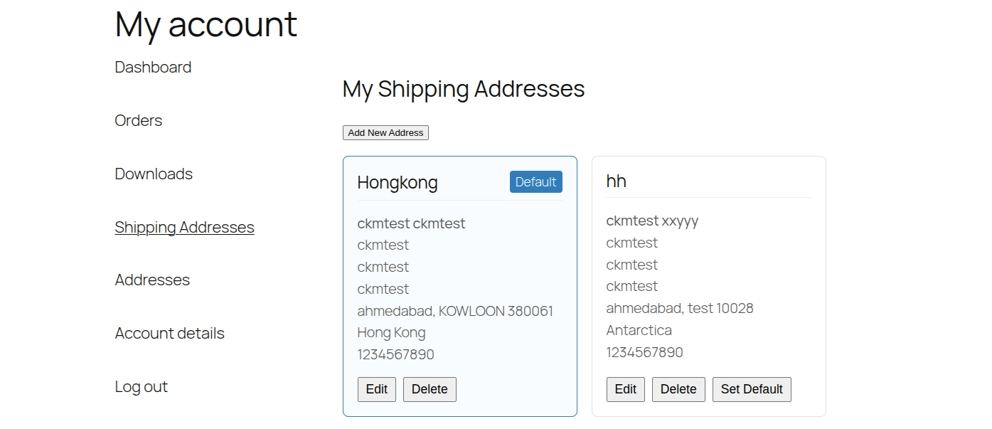 • My Account Integration: Adds a clean, native-looking “Shipping Addresses” tab to the user account area.