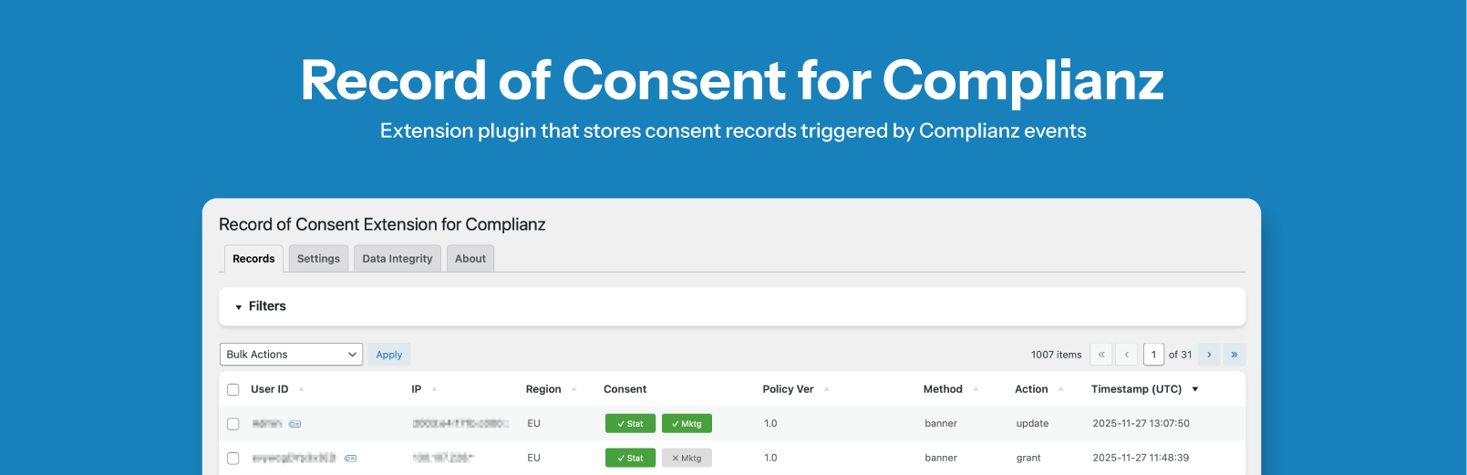 - Consent records will be stored automatically when Complianz triggers consent events.